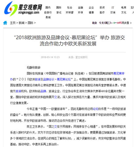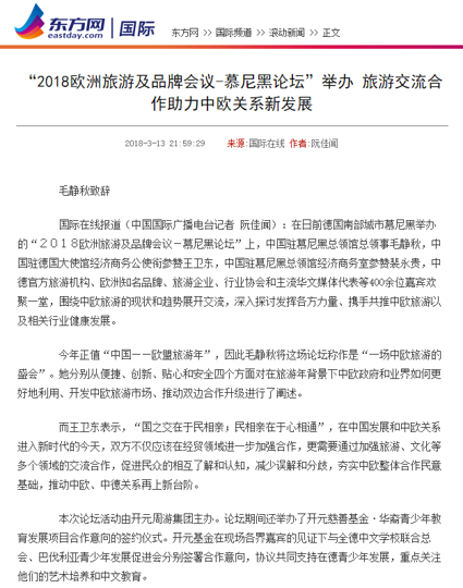“国之交在于民相亲;民相亲在于心相通”,在中国发展和中欧关系进入新时代的今天,我们不仅需要经贸领域进一步加强合作,更需要通过加强旅游、文化等多个领域的交流合作,促进民众的相互了解和认知,减少误解和分歧,夯实中欧整体合作民意基础,推动中欧、中德关系再上新台阶。2017年是“中德旅游年”,2018是李克强总理和欧盟委员会主席容克共同指定的“中国—欧盟旅游年”,正如中国驻德大使馆经济商务公使衔参赞王卫东所肯定的,2018欧洲旅游及品牌会议-慕尼黑论坛”暨开元周游招待晚宴除了有加强旅游业界交流、促进行业合作发展的直接作用,更重要的是还有便利和加强民间交往和沟通,促进双方更全面更深入合作的深远意义!