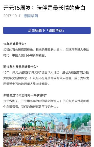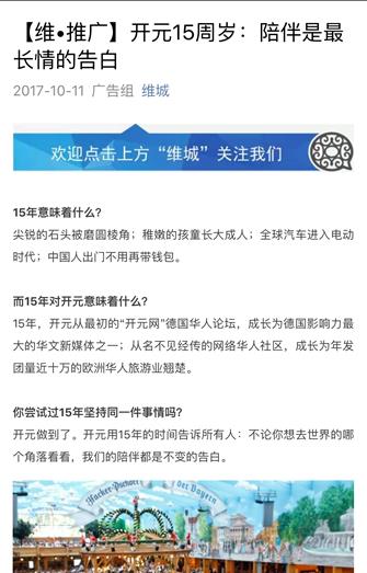 2015年,开元网正式开通微信公众号,成为德国最受欢迎的新闻类资讯号,单篇文章最高阅读量高达百万。
