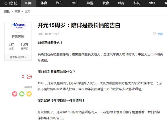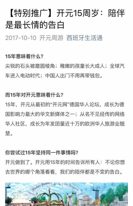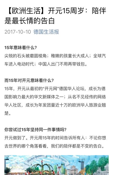 2017年,开元周游迎来了第15个年头,欧洲时报德国版、德国华商报、德国生活报、欧洲时报奥地利版、西班牙、意大利等多家华文媒体竞相报道。