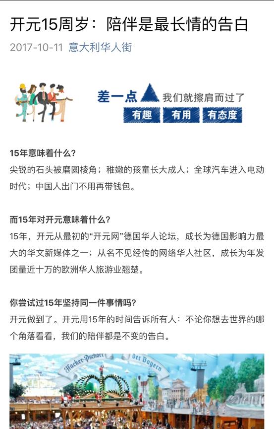 15年,开元从最初的“开元网”德国华人论坛,成长为德国影响力最大的华文新媒体之一;从名不见经传的网络华人社区,成长为年发团量近十万的欧洲华人旅游业翘楚。