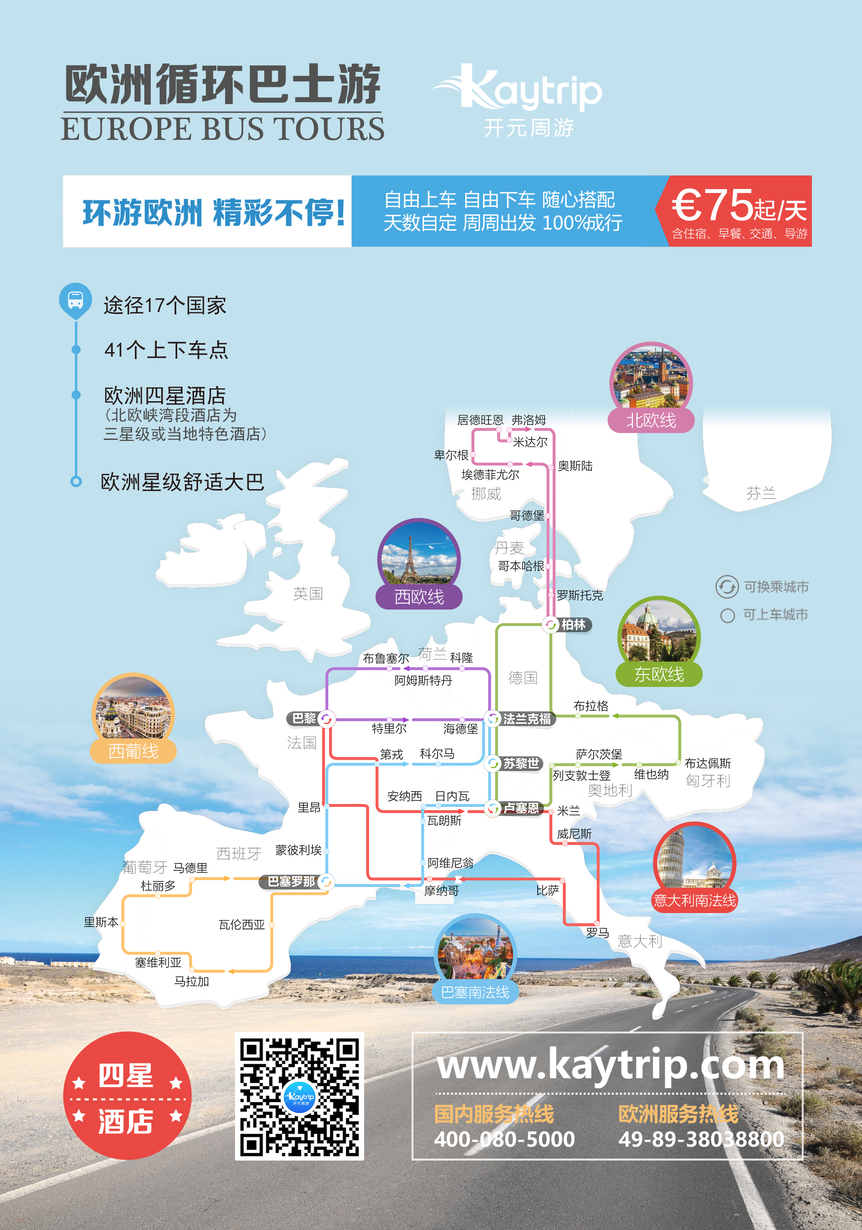 欧洲循环巴士游是开元周游旅行社主打的特色旅游项目,也是本次展会主推产品,途径17个国家,费用按天计算,日均价格固定,线路选择自由,可以随心定制自己的欧洲环游计划!不仅可以来一场说走就走的旅行,也可以说停就停。