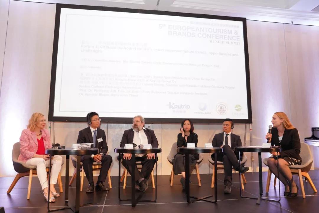 主题演讲之后一共安排了旅游与品牌两场专业论坛。DragonTrail的传媒经理Sienna Parulis-Cook女士作为两场论坛的主持人,首先邀请了众信旅游集团高级副总裁林岩女士、开元周游集团总裁周鸿图先生、中德导游文化交流协会创会会长尚尔勇先生、中国出境游研究所总监Wolfgang Arlt教授以及来自Referentin China的Dr. Annette Biener女士作为嘉宾。他们以“中欧旅游的现状和未来趋势”为主题,就中国市场和消费者对旅游业产生的影响,针对中国消费者的支付习惯做出的商业模式的改变以及未来的发展趋势进行了友好而富有深度的讨论。
