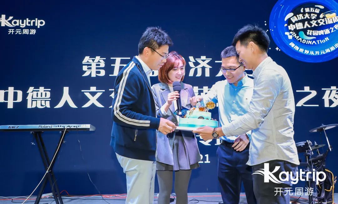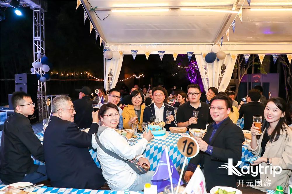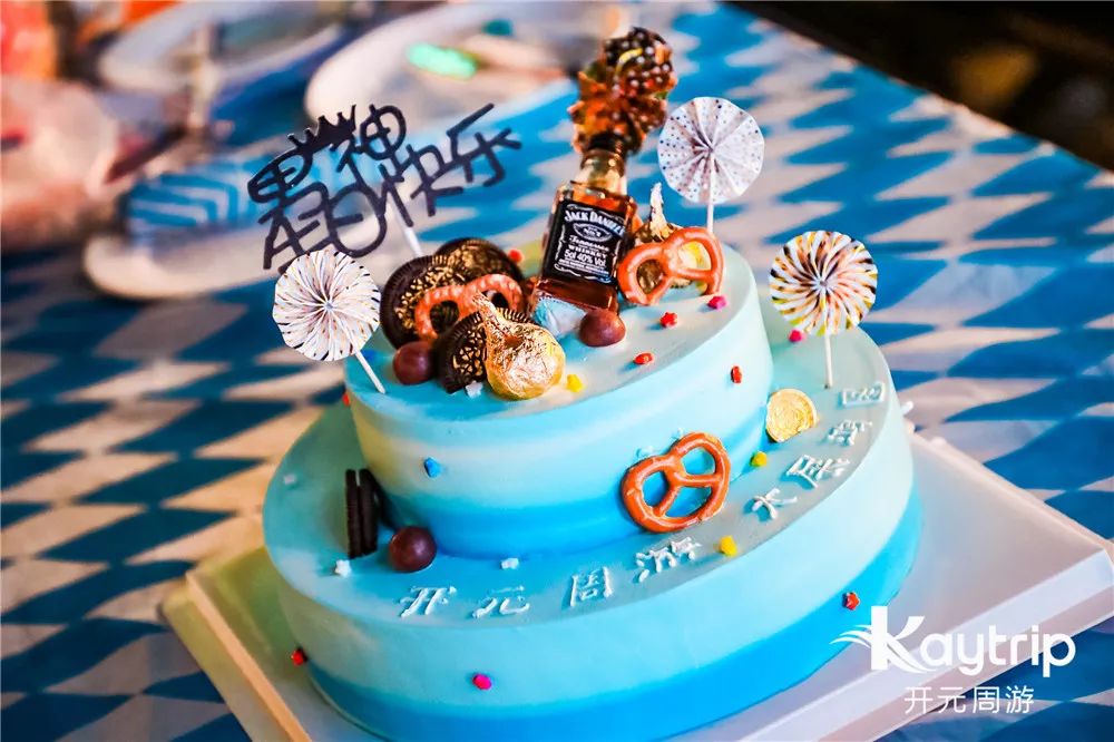 在活动进行中,一个精致的生日蛋糕被送上了舞台。今天恰好是开元周游创始人、总裁周鸿图先生的生日,全场为周总齐唱生日歌庆生,在音乐、啤酒、美食和朋友相伴下,许下心愿,感谢大家这么多年以来对开元周游的支持和关爱。