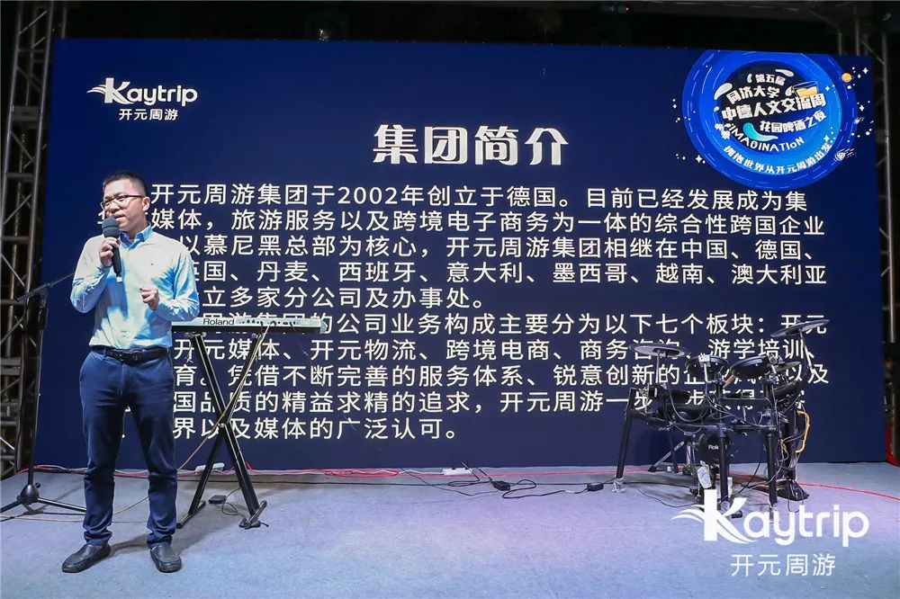 开元周游集团公司创始人、总裁周鸿图先生在现场致辞中表示,作为97级同济大学校友,在德国留学时创办了中国留学生网络社区论坛到后来发展成开元周游集团,开元周游始终与同济大学校友会保持密切交流。也正是这份渊源才有了15年开始的首届德国文化体验周和今天第五届同济大学中德人文交流周花园啤酒之夜的开元周游专场。这样的渊源不仅仅是作为同济校友的自豪也是作为同济大学校友企业的荣幸。