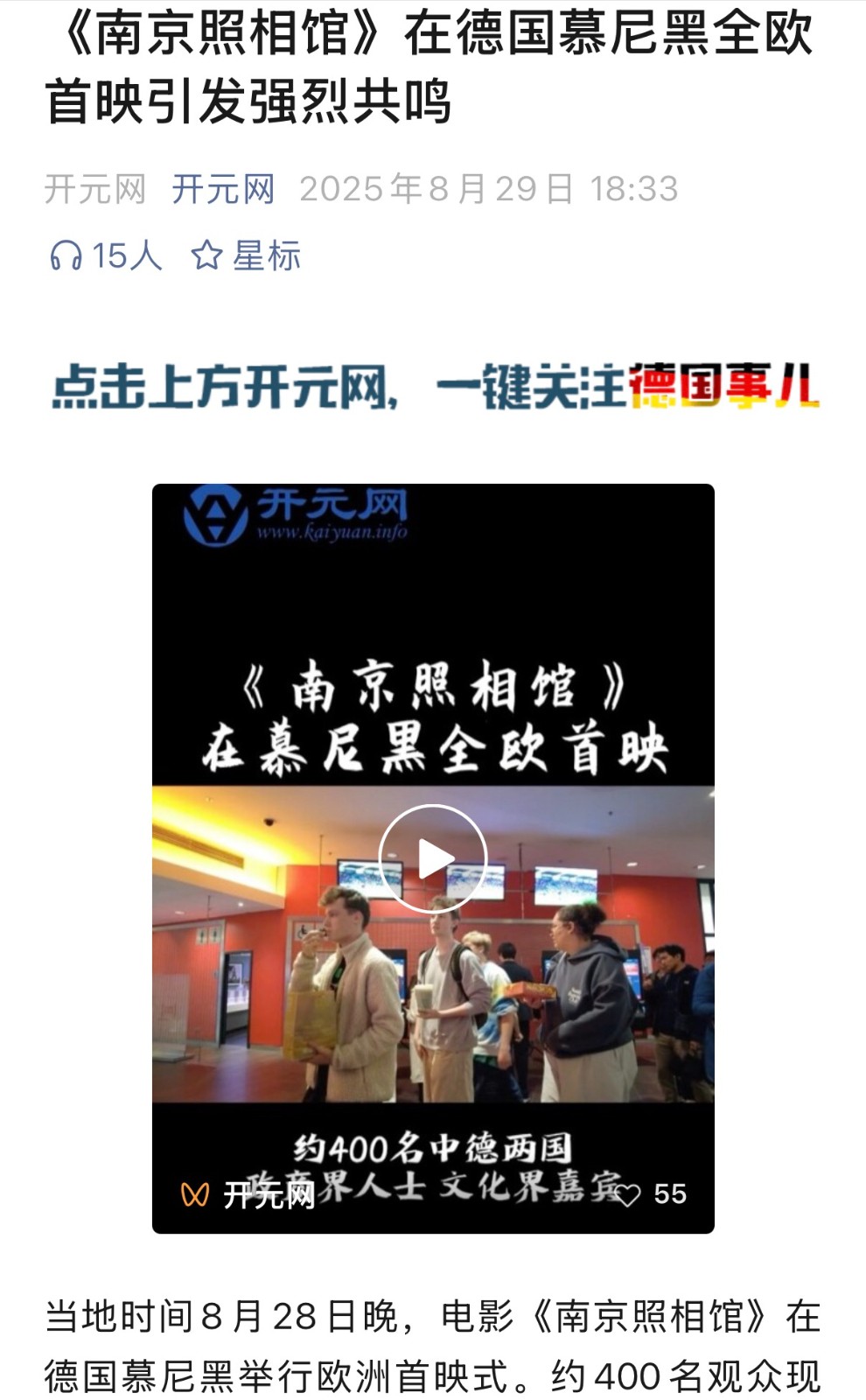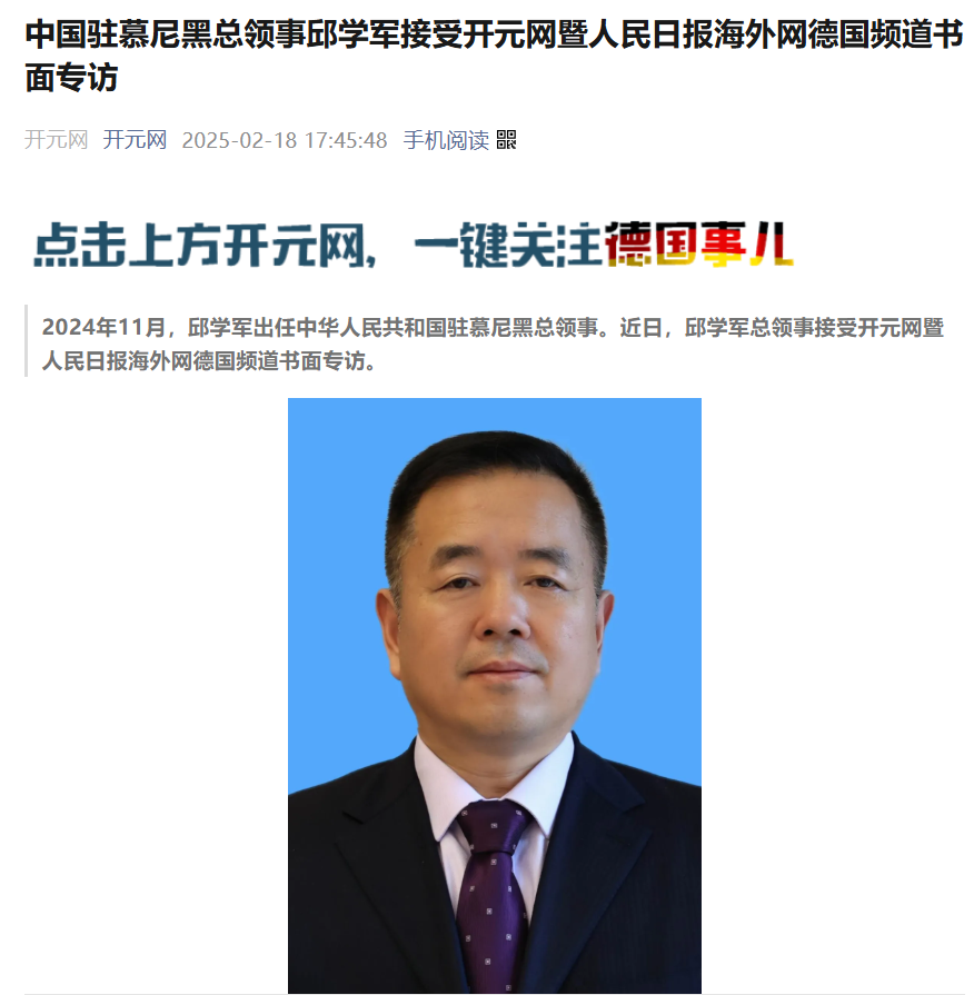 2月,中国驻慕尼黑总领事邱学军接受开元网暨人民日报海外网德国频道书面专访;3月,德国开元网走进人民大会堂,报道全国“两会”声音;8月,德国开元网受邀参加2025海外华文传媒合作组织年会,开元网总裁周鸿图出席年会并发表主旨演讲;8月在慕尼黑报道《南京照相馆》在全欧的首映式;9月,德国开元网报道纪念中国人民抗日战争暨世界反法西斯战争胜利80周年大会、IAA慕尼黑车展;10月,德国开元网受邀参加由人民日报海外版主办,人民日报海外网承办的第六届海外华文新媒体论坛等。