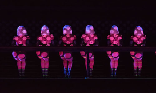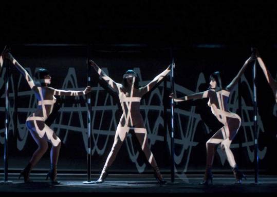 演出時,所有女演員不着上裝,或幾乎全身不着裝,以瑰麗奇幻的燈光與煙霧為衣紗,無限延伸觀者的遐想空間,在多彩的燈光和曲目下,展現出一場兼具聲光,感官效果的立體場面。光影魔術與女性線條的完美結合,講究的是活色生香,那些忽而柔媚,忽而剛勁在豐乳肥臀,色情拔高到美學的層次。