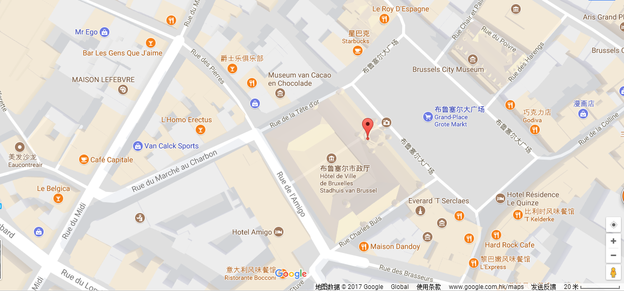 在布鲁塞尔大广场(Grand-Place),市政厅前( City Hall),旅游信息(tourist information)入口旁。(预定后将会收到更加详细的信息)