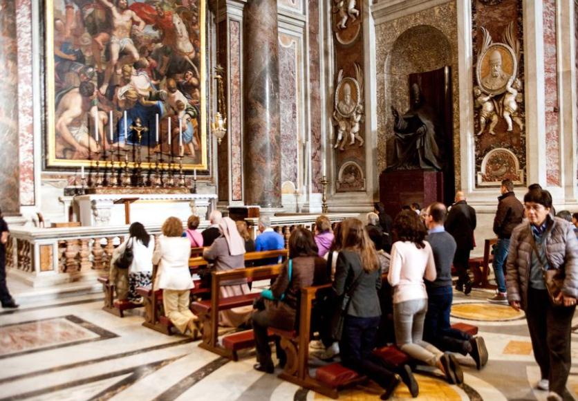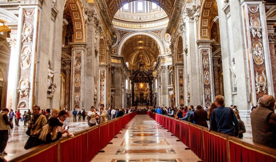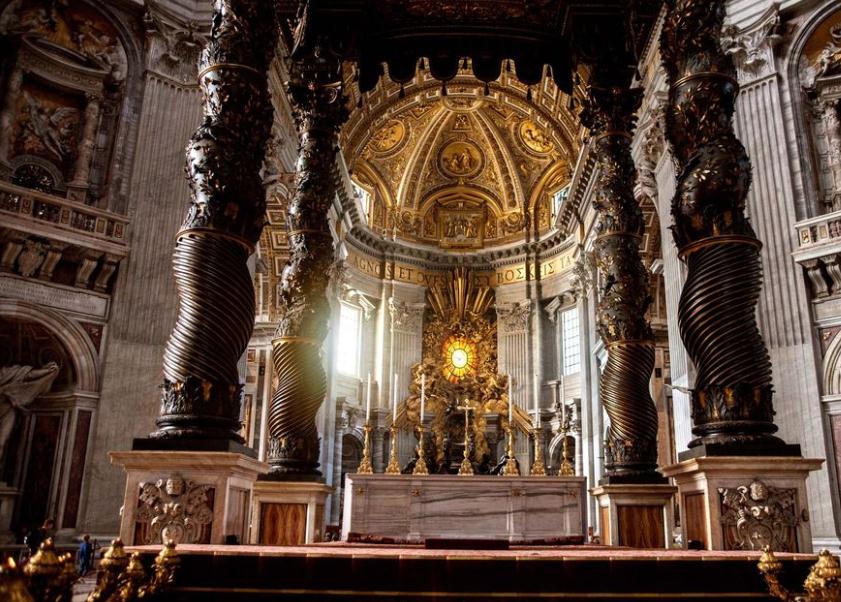 以從教堂中心的巴洛克之父貝尼尼的青銅華蓋開始,在那之下長眠着耶穌十二門徒之一聖彼得;也可從藝術巨