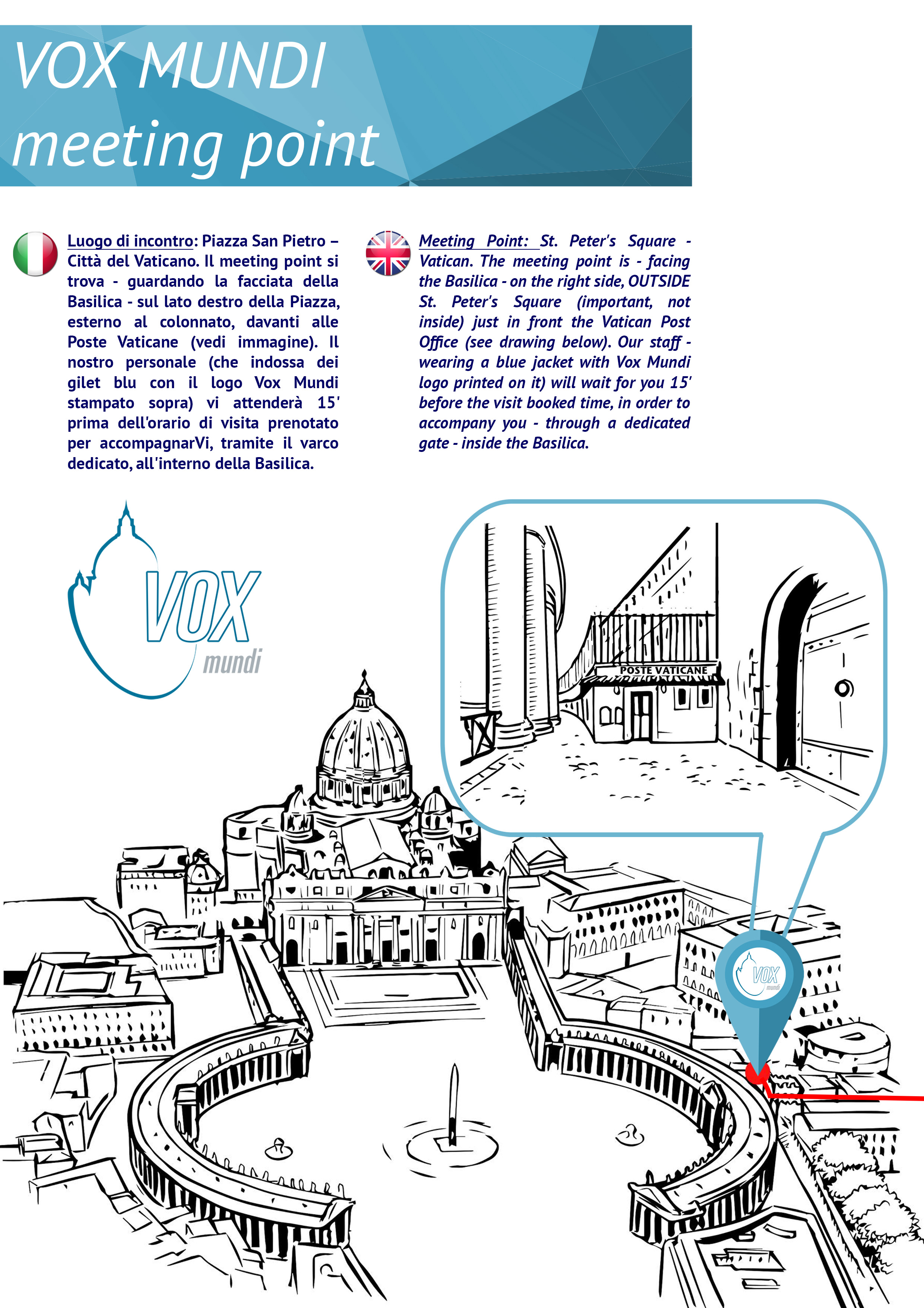 The meeting point is on the right side of Saint Peter's Square facing the Basilica, outside the colonnade of Saint Peter's Square (important: not inside), just in front of the Vatican post office.