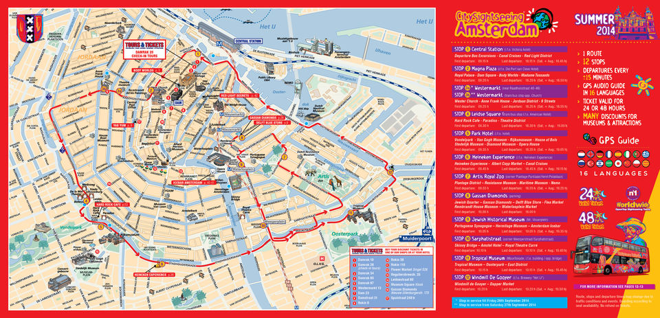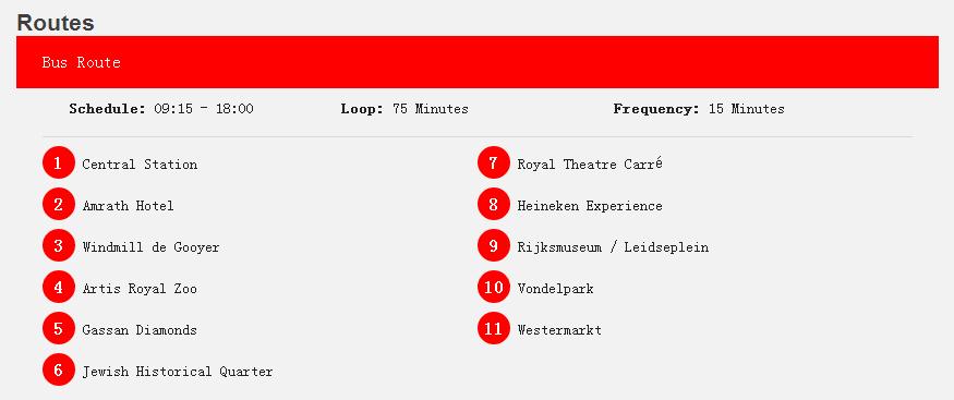 路線:Central Station - Amrath Hotel - Windmill/East - Artis Royal Zoo - Gassan Diamonds - Jewish Historical Museum - Heineken Experience - Museum Square - Stadhouderskade - Vondelpark - Wester Market - Amsterdam Museum - Central Station