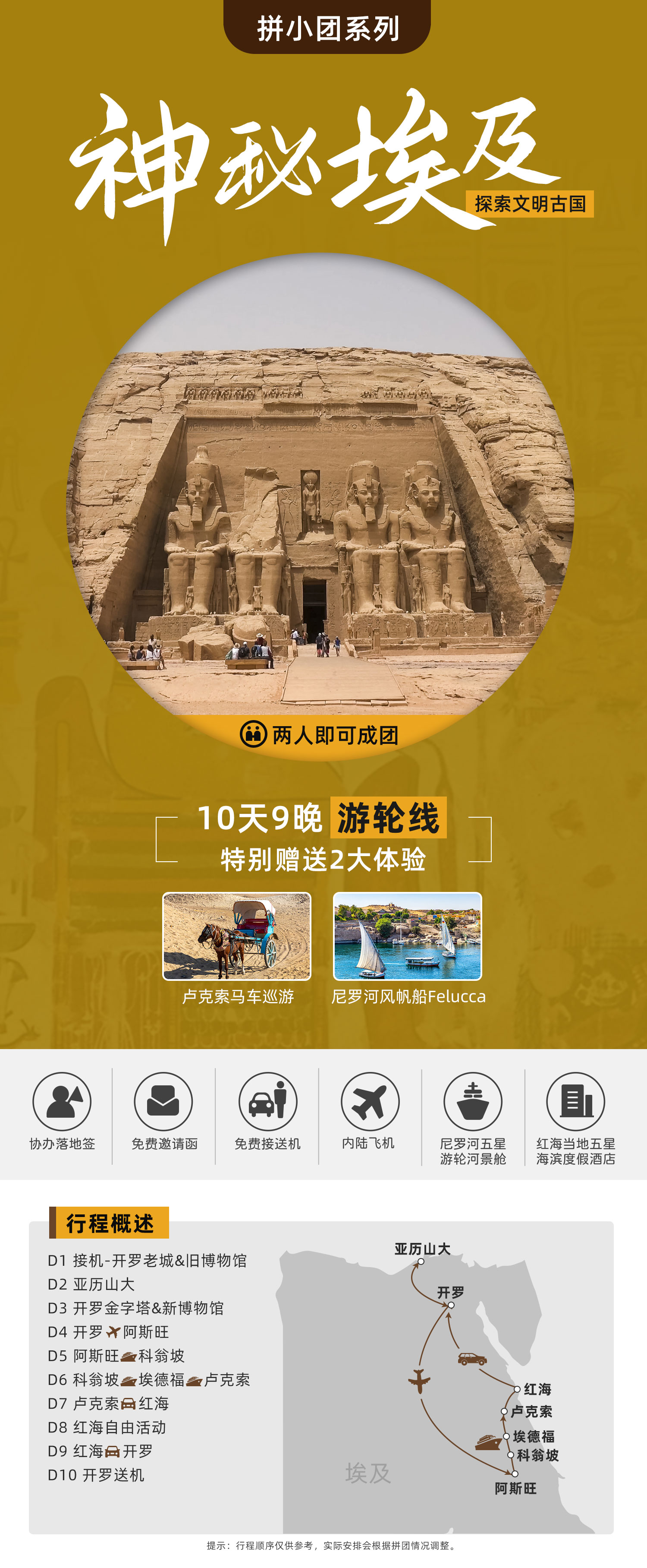 |>>2-12人拼小团<<| ♥ 特别赠送两大体验:马车巡游+风帆船Felucca ☥【游轮线】两人成团•协办落地签•免费邀请函•免费接送机•含1段内陆飞机•尼罗河五星游轮河景房•红海五星海滨度假酒店