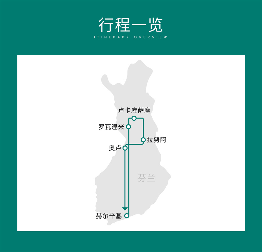 行程索要:赫尔辛基-罗瓦涅米-卢卡库萨摩-拉努阿-奥卢-赫尔辛基