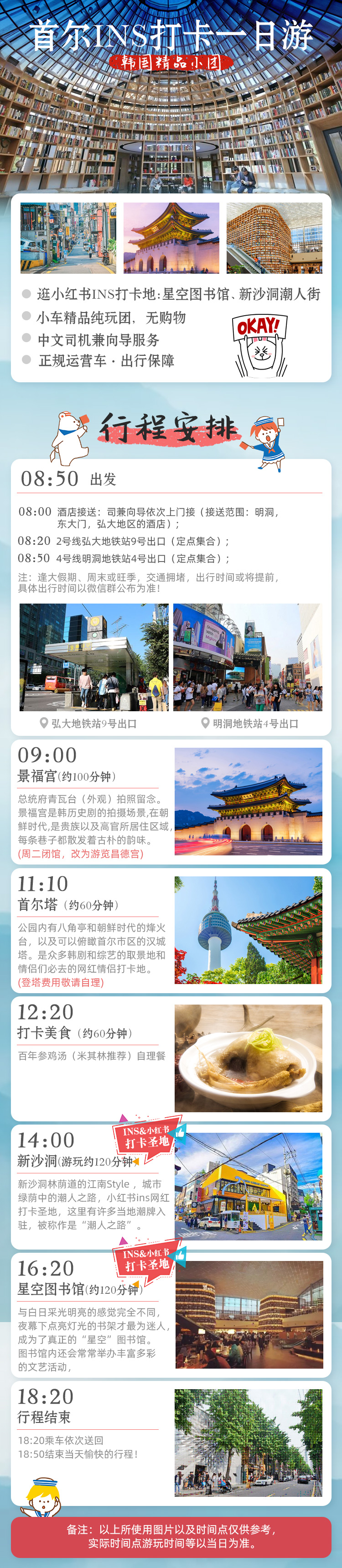 共4個上下車地點 首爾-景福宮-首爾塔-新沙洞-星空圖書館-首爾