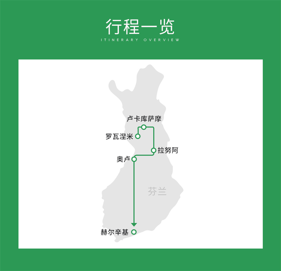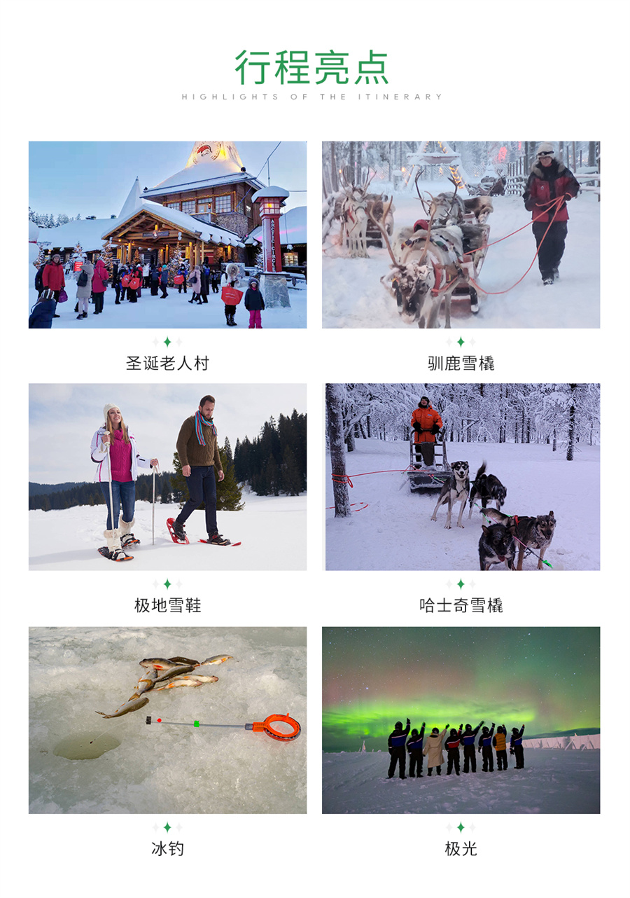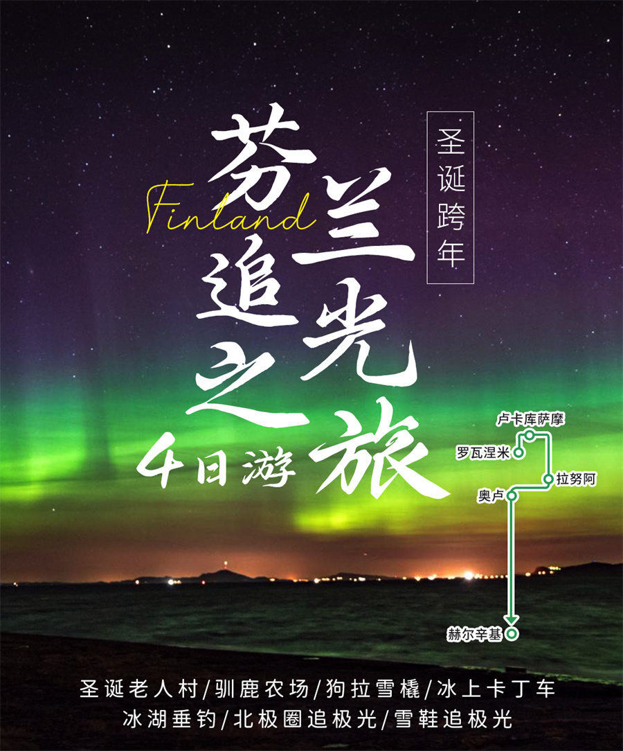 路线名称:圣诞跨年芬兰追光之旅4日游•圣诞老人村|驯鹿农场|狗拉雪橇|冰上卡丁车|冰湖垂钓|北极圈追极光|雪鞋追极光 ; 芬兰4日跟团游·【罗瓦涅米+圣诞老人村+哈士奇雪橇+驯鹿雪橇+驯鹿农场+极地雪鞋+冰上卡丁车+冰钓+北极圈追寻极光+拉努阿动物园】 [ 欧洲旅游, 季节盛宴, 极光之旅 ]