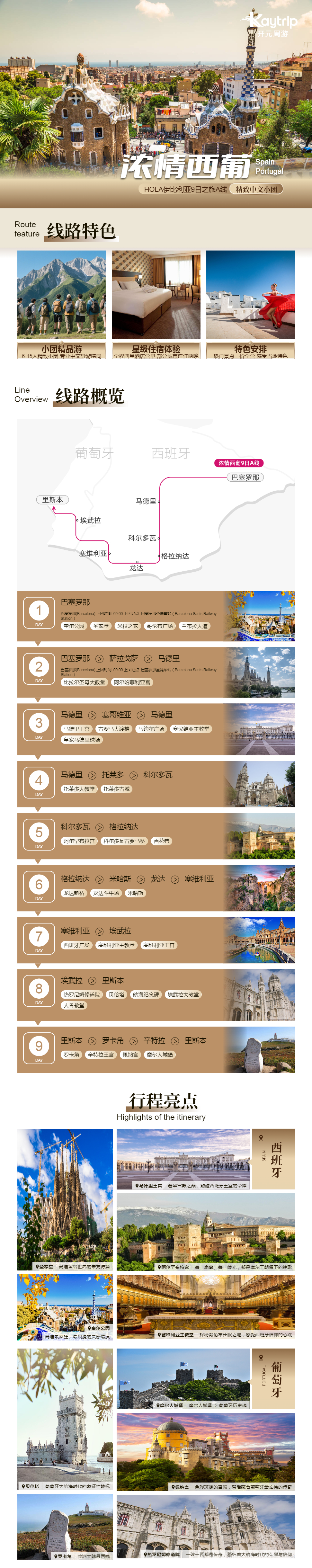 路线名称:浓情西葡▪HOLA伊比利亚9日之旅A线【精致中文小团】< 巴塞罗那上 里斯本下> ; 伊比利亚半岛跟团游·【罗卡角+辛特拉王宫+佩纳宫+贝伦塔+发现者纪念碑+热罗尼莫斯修道院+人骨教堂+埃武拉大教堂+塞维利亚王宫+龙达小镇+米哈斯+阿尔罕布拉宫+科尔多瓦+托莱多古城+罗马大渡槽+塞哥维亚主教堂+马德里王宫+太阳门广场+皇家马德里球场+比拉尔圣母大教堂+阿尔哈菲莉亚宫+圣家堂+奎尔公园+米拉之家】 [ 欧洲旅游, 精致小团 ]