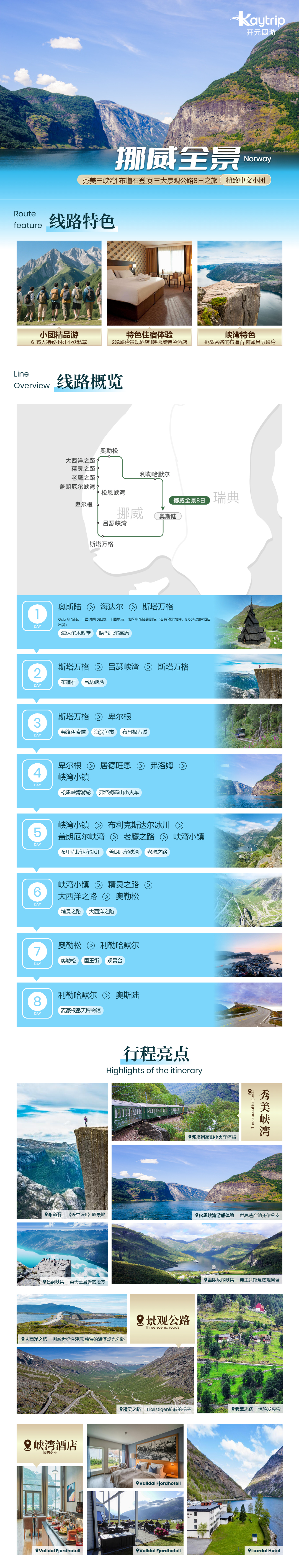 行程索要:奥斯陆-海达尔-斯塔万格-吕瑟峡湾-斯塔万格-卑尔根-居德旺恩-弗洛姆-峡湾小镇-布利克斯达尔冰川-盖朗厄尔峡湾-老鹰之路-峡湾小镇-精灵之路-大西洋之路-奥勒松-利勒哈默尔-奥斯陆