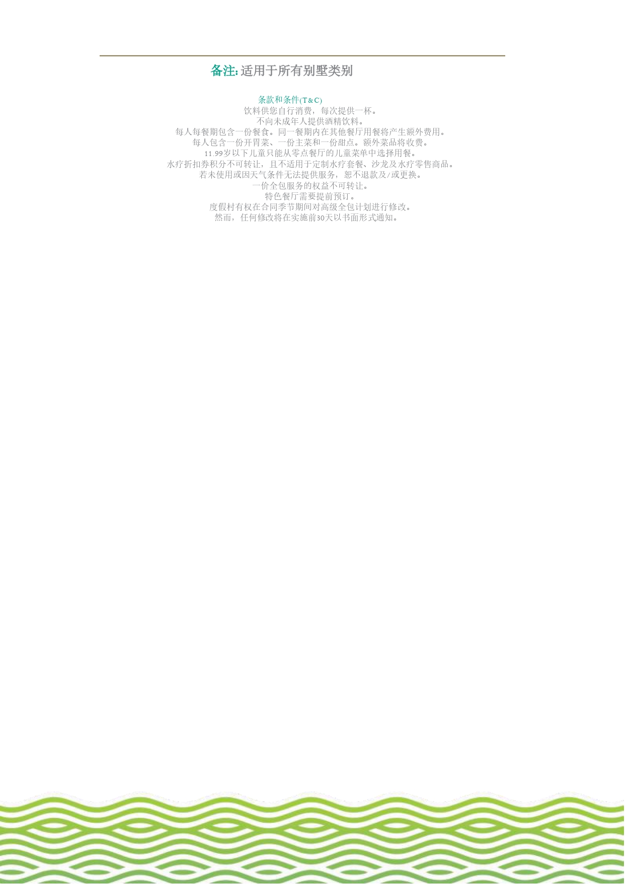 ⑥8家酒吧的随心选择,享受无限量的香槟,高级烈酒,威士忌,朗姆酒,杜松子酒和伏特加-均来自著名的手工酒厂,100多款酒标的葡萄酒,啤酒,鸡尾酒,非酒精饮料,软饮料,新鲜果汁,健康饮料,咖啡和茶。