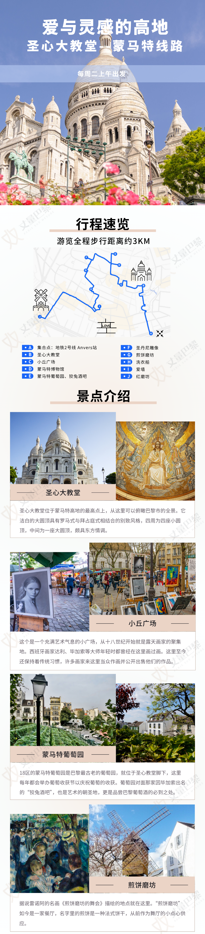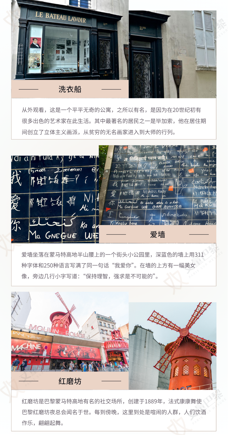 共2个上下车地点 地铁2号线Anvers站-圣心大教堂-小丘广场-蒙马特博物馆-蒙马特葡萄园-狡兔酒吧-圣丹尼雕像-煎饼磨坊-洗衣船-爱墙-红磨坊