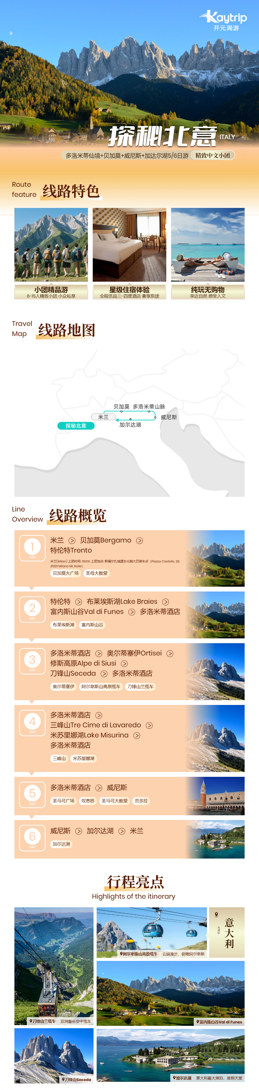 路线名称:探秘北意▪多洛米蒂仙境+贝加莫+威尼斯+加尔达湖5/6日游【精致中文小团】<米兰上下> ; [ 欧洲旅游, 精致小团 ]