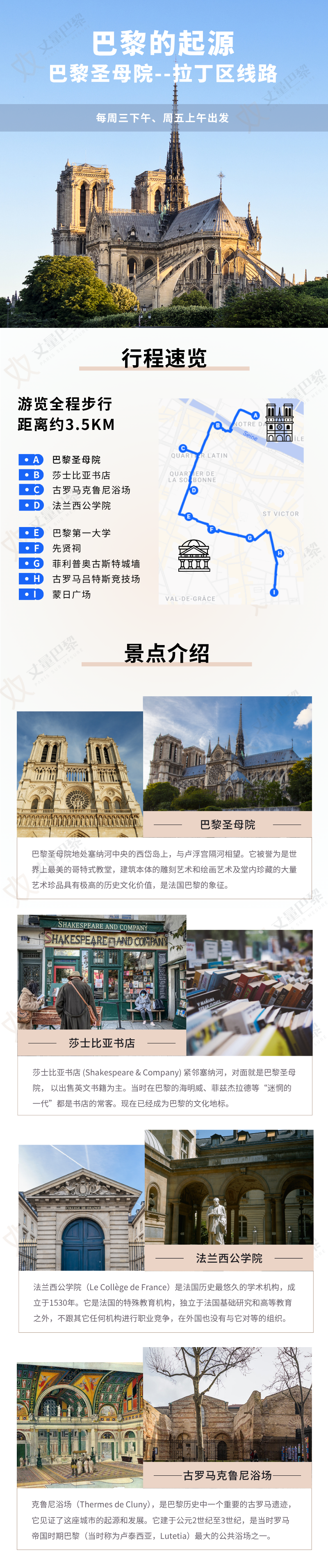 共3个上下车地点 巴黎圣母院-莎士比亚书店-古罗⻢克鲁尼浴场-法兰西公学院-巴黎第一大学-先贤祠-菲利普奥古斯特城墙-古罗⻢吕特斯竞技场-蒙日广场