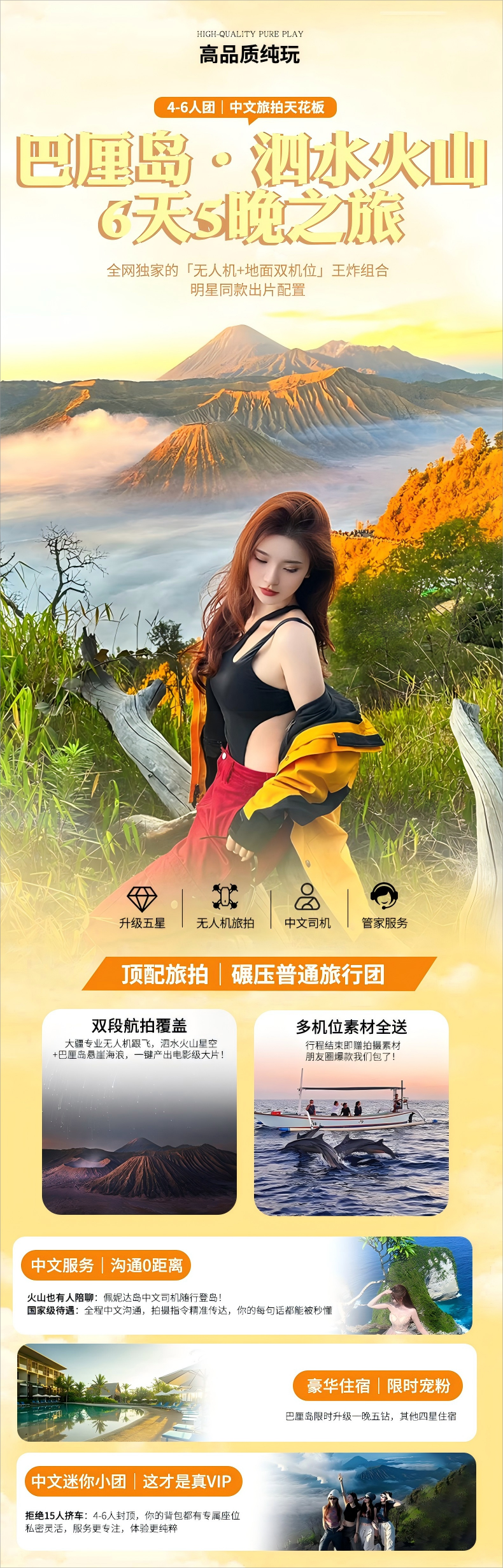 路线名称:印度尼西亚巴厘岛·泗水火山 | 布罗莫+塔布汗浮潜+赛武+罗威纳+佩尼达6天5晚(中文旅拍4-6人小团) ; 双段航拍覆盖 多机位素材全送 泗水火山星空 +巴厘岛悬崖海浪,一键产出电影级大片 [ 亚洲旅游, ]