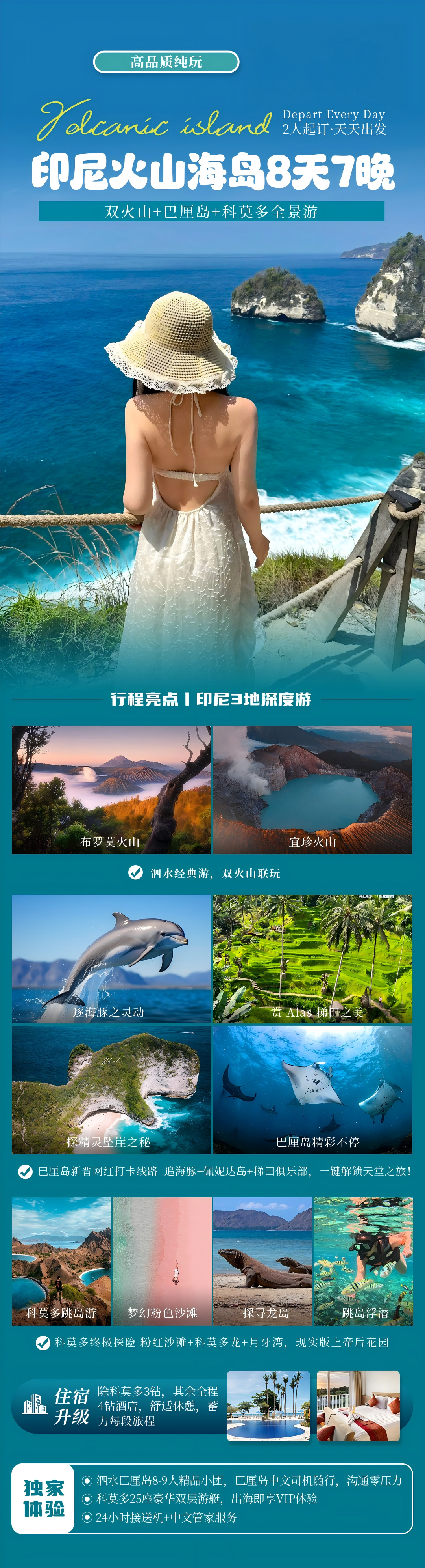 共2个上下车地点 泗水接机-布罗莫火山-宜珍火山或(塔布汗岛浮潜,满4人选可换)-罗威纳追海豚-乌布梯田俱乐部-佩尼达西线-出海浮潜-巴厘岛南部一日游-科莫多英文拼团一日游