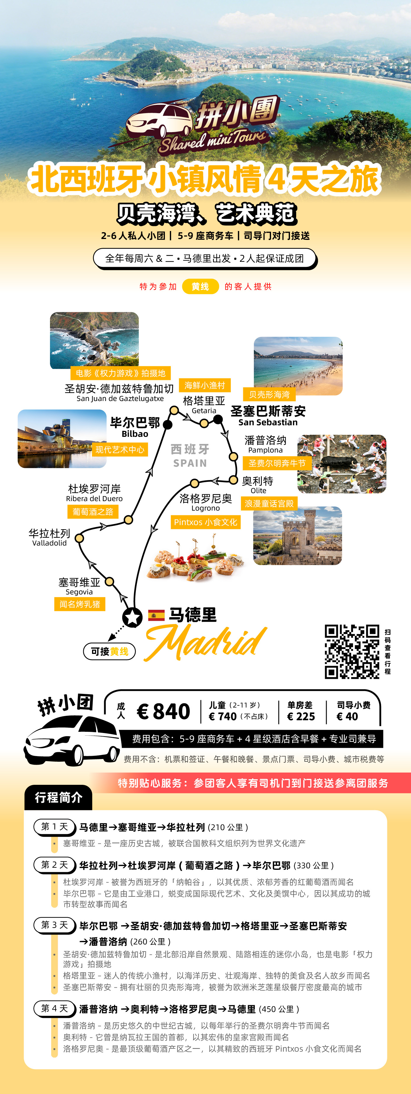 行程索要:馬德里 - 塞哥維亞 - 華拉杜列 - 杜埃羅河岸 - 畢爾巴鄂 - 聖胡安·德加茲特魯加切 - 格塔里亞 - 聖塞巴斯蒂安 - 潘普洛納 - 奧利特 - 洛格羅尼奧 - 馬德里