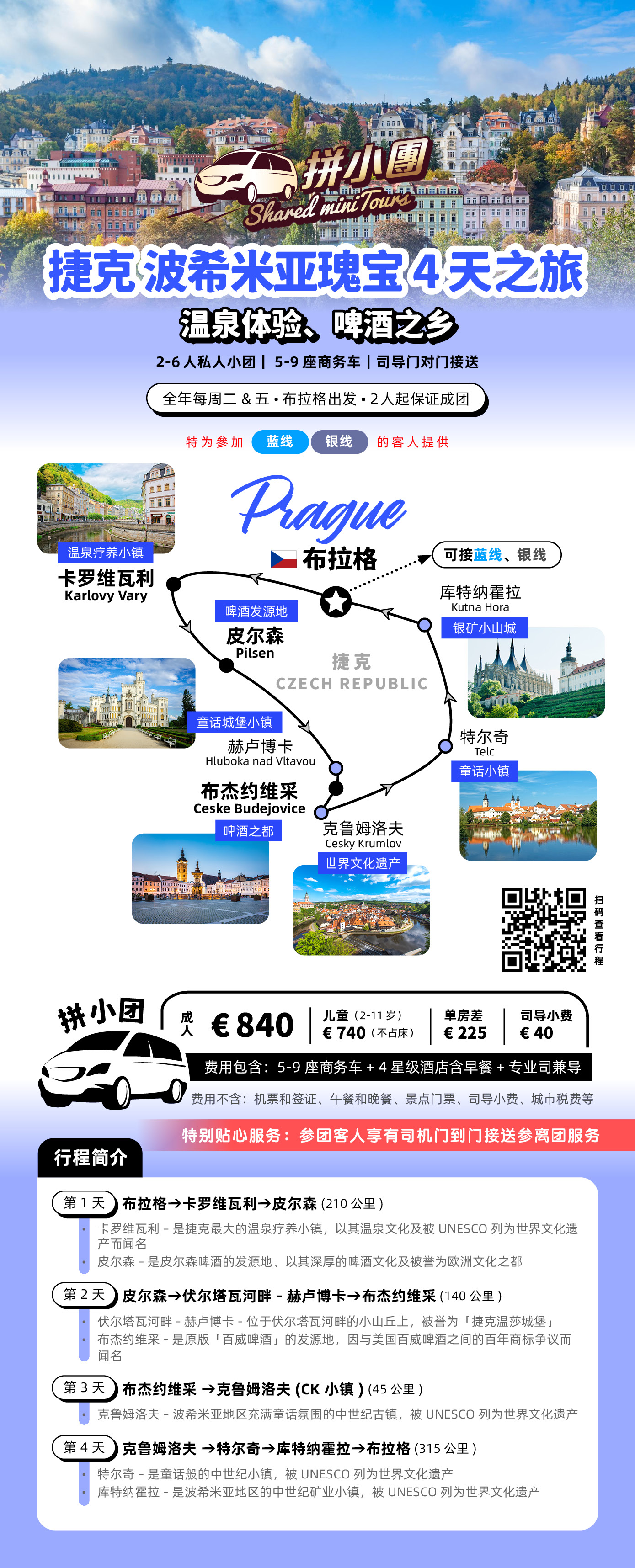 共2個上下車地點 布拉格-卡羅維瓦利-皮爾森-伏爾塔瓦河畔-赫盧博卡-布傑約維采-克魯姆洛夫-特爾奇-庫特納霍拉-布拉格
