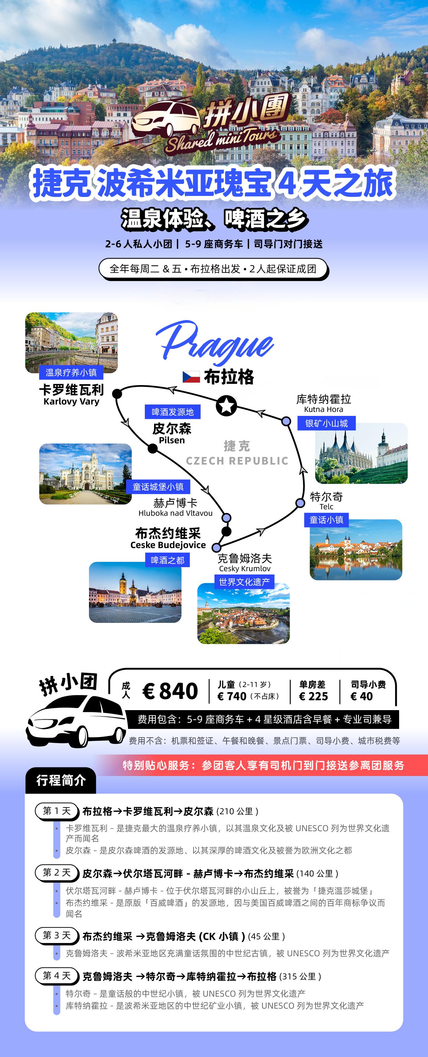 共2個上下車地點 布拉格-卡羅維瓦利-皮爾森-伏爾塔瓦河畔-赫盧博卡-布傑約維采-克魯姆洛夫-特爾奇-庫特納霍拉-布拉格