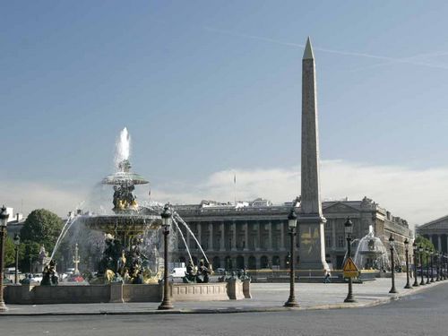 协和广场(Place De La Concorde) 建于1757年至1779年,在法国大革命期间这里是行刑的场所,路易十六,其王后等许多有名的人 物在这里被处死。至1840年形成今天这样的规模,广场 中央耸立着一块从卢克索神庙搬来的埃及方尖碑,碑高23米,碑身刻满了称颂拉姆西斯二世法老光辉 业绩的象形文字。广场周围有八座象征法国主要城市的雕塑。 广场北靠近王家大街一侧有俩座带柱廊的大楼,现在是海军部和克利雍饭店所在地。