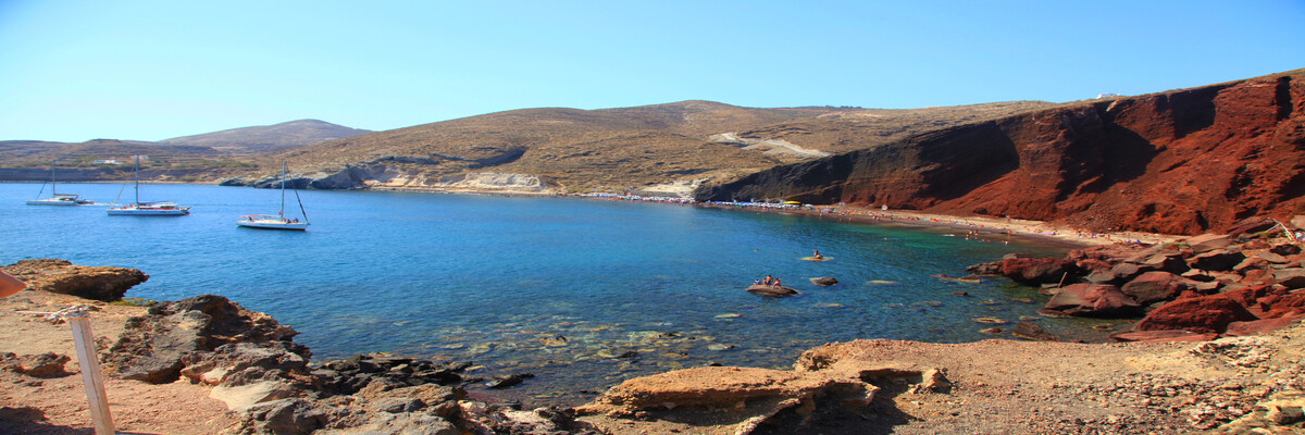 圣托里尼的红沙滩就是个神话一般的地方。这片海滩位于岛屿南段,由于细砂与海边的山崖呈现火红的色泽而得名。红沙滩上常常躺满身材火辣的比基尼美女和拎着帆板冲浪的古铜色肌肤帅哥。