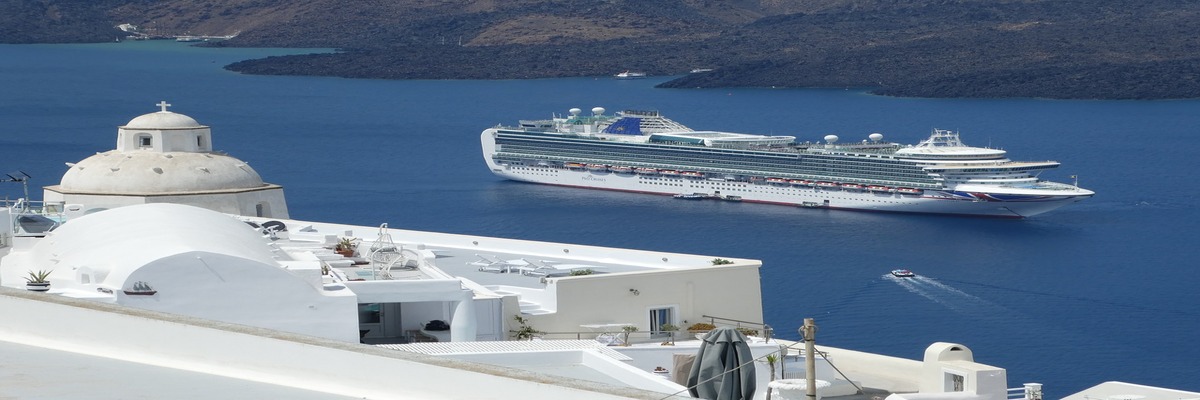 从米克诺斯岛乘船到圣特里尼岛约需5小时航程。来到以后,才知道很多观光手册和旅行社都把米克诺斯岛和圣特里尼岛作为推荐给游客的首选。圣特里尼岛的城市是建立在呈月牙形的岛的顶端。