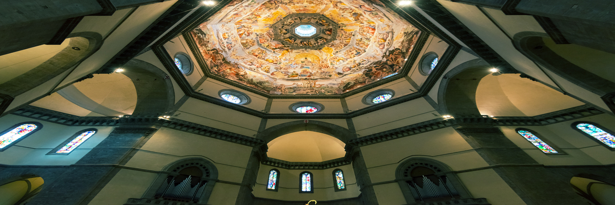 这座教堂大圆顶是继罗马万神庙之后的又一大圆顶,是菲利浦·布鲁内莱斯基(1377~1446)的杰作,设计并建造于1420年到1434年间,这位巨匠在完成这一空中巨构的过程中没有借助于拱架,而是用了一种新颖的相连的鱼骨结构和以椽固瓦的方法从下往上逐次砌成。圆顶呈双层薄壳形,双层之间留有空隙,上端略呈尖形。它高91米,最大直径45.52米。