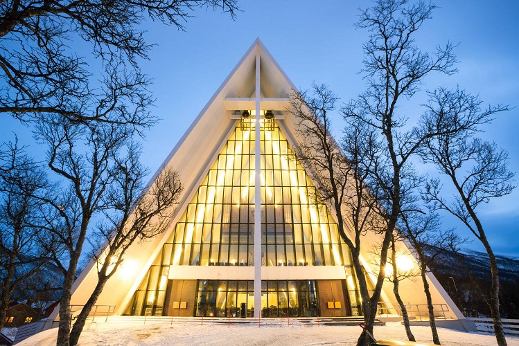 又称特罗姆斯达伦教堂,于 1965 年 11 月 19 日落成,是城市的标志性建筑,在海峡、大桥及飞机降落时都能看到。西侧主入口被带有明显十字架的大型玻璃幕墙环绕,东侧则是玻璃马赛克,描绘着上帝之手,还包含诸多符号。教堂屋顶两侧由 11 块镀铝混凝土板构成,内部装饰庄严朴素。游客通常在外景拍照打卡 10 分钟;爱好者可入内参观 30 分钟。