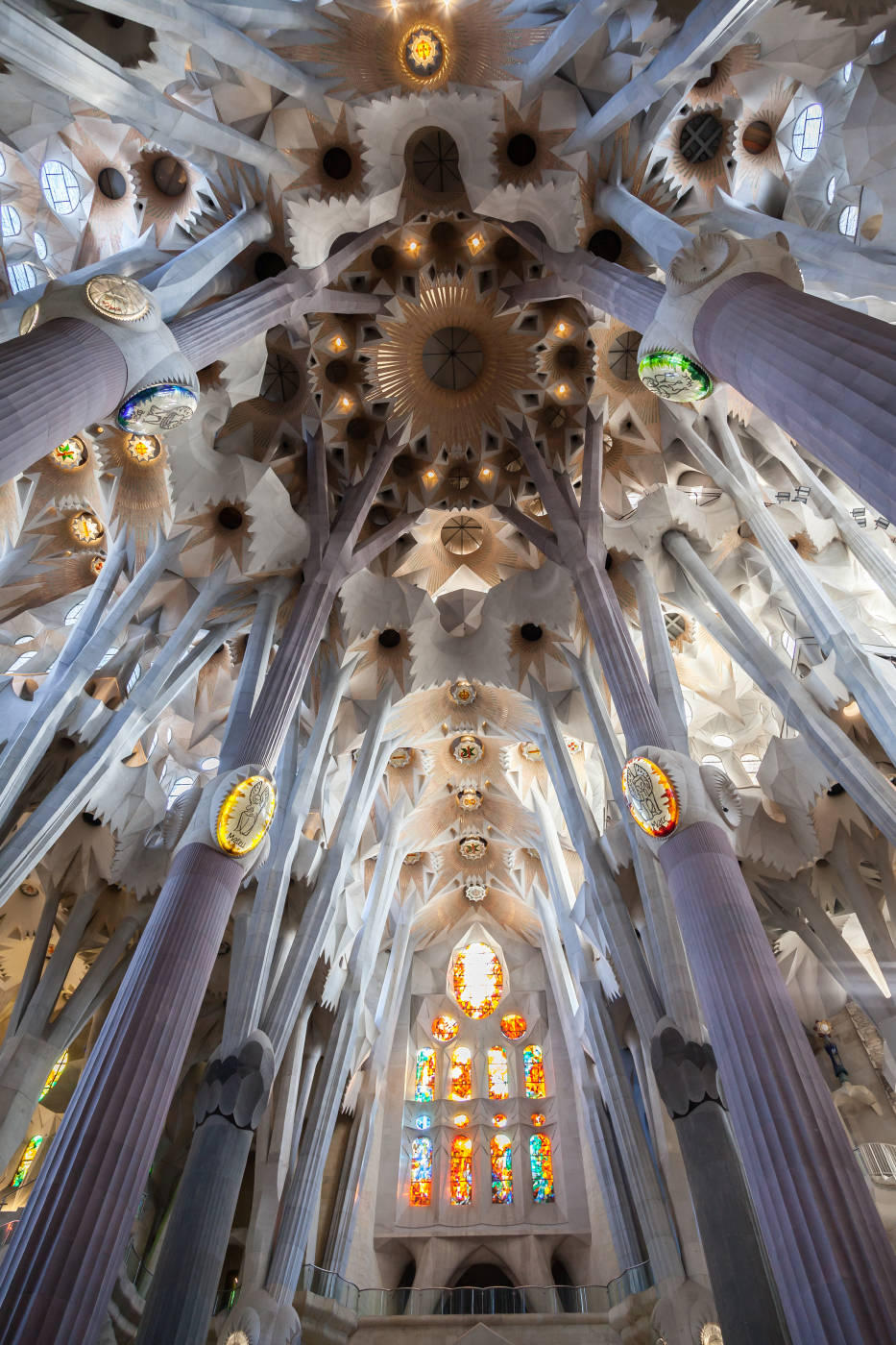 步入主殿的瞬间,访客无不为巧夺天工的设计所震撼。仿若参天巨树的立柱群撑起挑高的穹顶,营造出神圣的森林意象。最令人惊叹的是两侧彩窗的精妙设计:北侧采用蓝绿色系的冷色调玻璃,南侧则配置红黄色系的暖色调玻璃,随着日光角度变化,殿内时刻上演着绚丽迷离的光影交响曲。