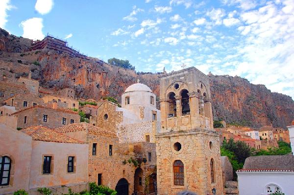 从纳夫普利翁继续向南,沿着伯罗奔尼撒半岛东海岸行驶约三小时,景观逐渐变得粗犷。当一座巨大的岩石突兀地从海中升起,并通过一条狭窄的长堤与大陆相连时,目的地莫奈姆瓦夏就到了。这个名字在希腊语中意为“唯一的入口”,精准地描述了它的地理特征。