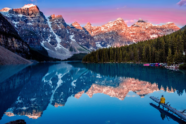 梦莲湖被誉为落基山脉的明珠,其湖水因富含冰川岩粉而呈现出变幻莫测的蓝绿色,如同镶嵌在十峰谷中的一块宝玉。要欣赏其经典全景,必须攀登一旁的“岩石堆”小径。虽然攀登需要约20-30分钟,但登上观景台的那一刻,所有辛苦都化为乌有:十座雪山倒映在如镜的湖面上,构成一幅对称而完美的画面,这正是加拿大旧版二十元纸币背面的图案。
